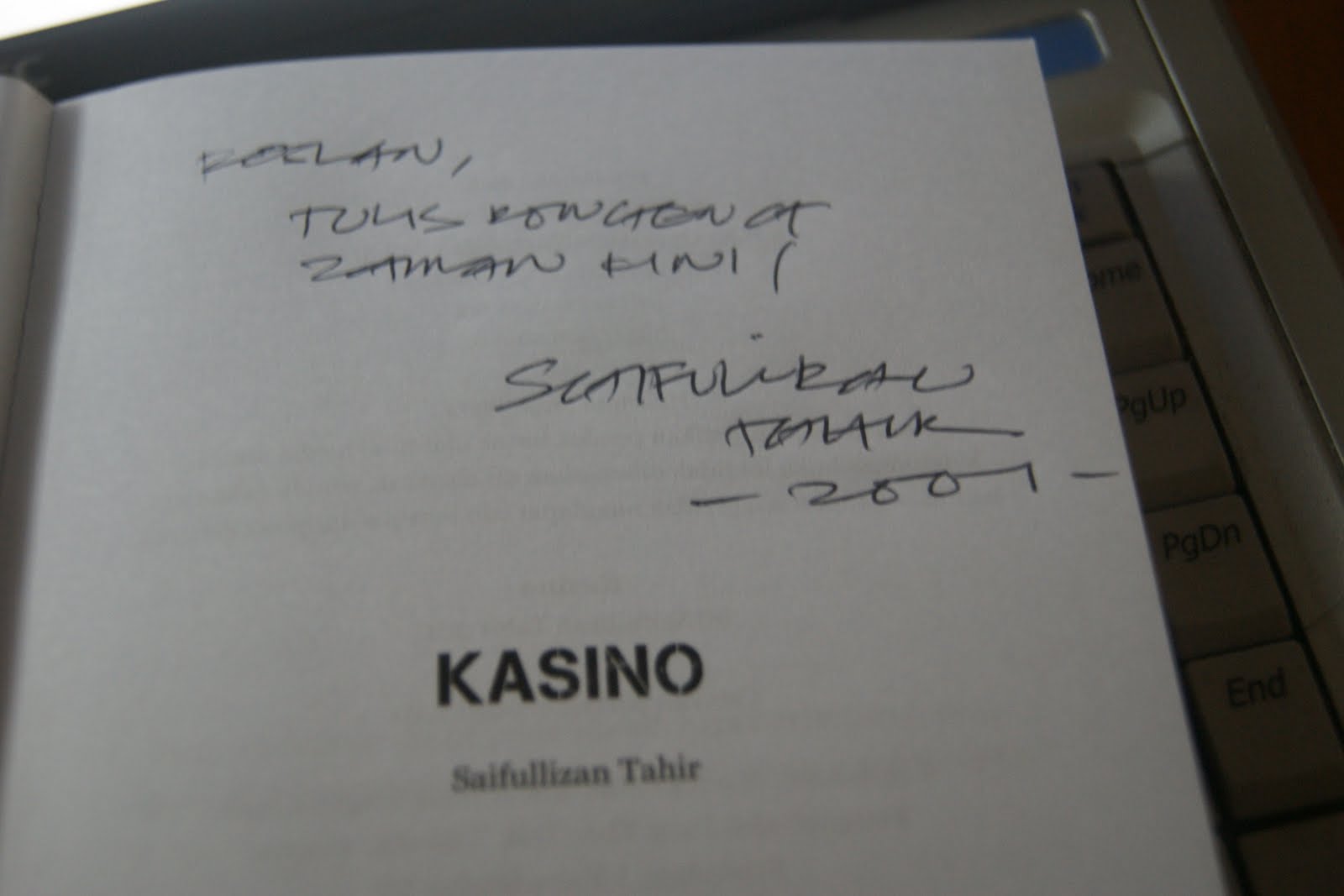 Sementara saya, Wan Nor Azriq dan Sufian Abas duduk dengan muka menahan puasa, sepuluh atau lima minit kemudian novelis KASINO pun datang. Saya agak impress dengan penampilan penulis tersebut. Dengan kot warna hitam dan bertali leher juga warna hitam serta kasut juga sewarna, saya fikir, inilah wajah dan citra penulis kelas menengah. Jika anda sudah membaca novel KASINO, anda akan memngesani betapa teliti dan tajamnya penelitian Saifullizan Tahir ke atas barangan dan jenama yang dipakai oleh para wataknya.