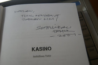Selain baharu merasakan diri saya menjadi artis pada petang di kawasan Bangsar Baharu, saya juga berkesempatan berbual-bual dengan seorang penjudi dan kemudian bergambar bersama dalam gambar kenangan. Terima kasih Saifullizan Tahir kerana memberi novel KASINO dengan percuma. Hehe.