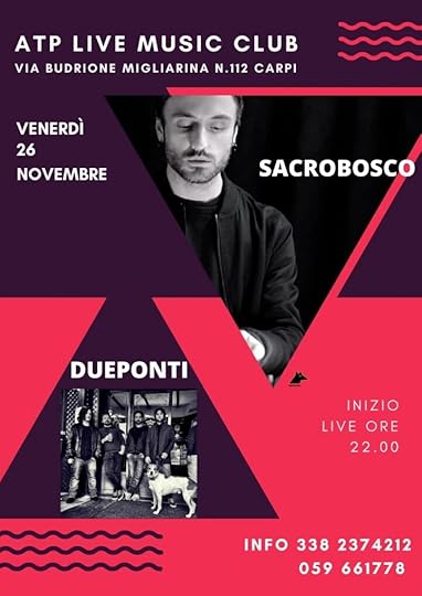 E, guarda un po’, venerdì 26 novembre, più o meno alle 22, coi DUEPONTI (in maiuscolo, tutto attaccato) suoniamo all’ATP Live Music Club di Migliarina, frazione di Carpi, in provincia di Modena, un posto altrimenti conosciuto come Zazzabar. Suoniamo prima di SACROBOSCO (in maiuscolo, tutto attaccato) per una serata organizzata da Gigiabooking (anche loro tutti attaccati).