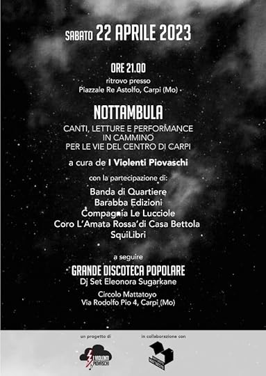 E il 22 aprile, cioè domani, dalle 21 circa, succede una cosa bellissima in giro per le vie del centro di Carpi: si chiama Nottambula, succede tutti gli anni, o almeno questa è la quinta edizione, ma quest’anno ci siamo anche io e il dottor Carlo Dulinizo a leggere una cosa insieme, a due voci, in una specie di micro reunion barabbista, una di quelle cose che facevamo quando eravamo molto giovani.