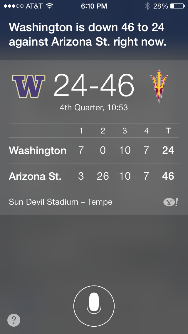 But this week we played Arizona State. ASU was briefly ranked #22 in week six but a loss at Notre Dame dropped them out of the top 25. I was not worried. The Huskies had proven themselves capable. With the win at Illinois they seemed to have broken the away-game curse (having not won an away game for ages before that).