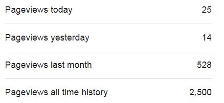 I woke up this morning and opened my browser and bam, got a nice surprise. This blog had exactly 2,500 pageviews. I was impressed. I started this blog in August of 2012 so it's only about seven month old. Now I know some blogs get 2,500 pageviews a day. But I'm happy with my 2,500 as of today.So thanks to everyone who has come to my blog to read my ramblings!