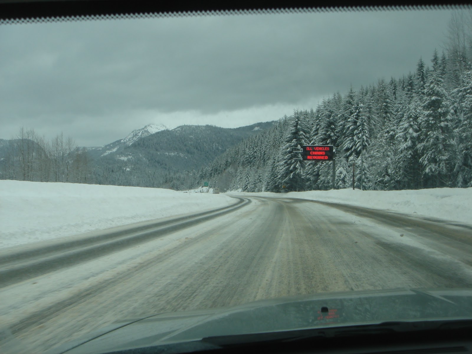 (if you can't read the orange sign it says "All Vehicles: Chains Required"). That means you have to put chains on your drive tires for traction.The State Patrol bases their requirements (it seems) on the lowest common denominator: the Seattle driver who can't drive in snow. On the day pictured above, there was no need for chains; the road was not that bad. But the State Patrol decided they were needed. And it's a $500 fine if you get caught with out them.