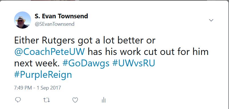 Last year when the Huskies played Rutgers, it was a blow out. The Huskies put in second stringers in the second half of the game. Rutgers scored 3 points in the entire first half. The final score (with second and third stringers playing most of the second half) was 13-48. That game was at Husky Stadium so a friendly crowd and home-field advantage probably helped.Last night's game at Rutgers was nothing like that. The Huskies' first series they went three and out. Then the Scarlet Knights scored a touchdown on their first possession. For most of the first half the Huskies struggled with missed throws and penalties. At the end of the first quarter, Rutgers led 7-3. The one highlight of the first half was a punt return by Dante Pettis that he ran in for a touchdown in the second quarter. That was his sixth career touchdown from a punt return, tying the Pac-12 record.