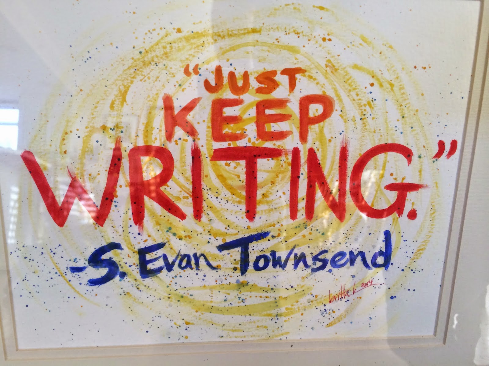 one I made up. It's "Just keep writing." No matter what, if you're a writer, you need to just keep writing. I haven't been living up to that quote very well lately. I don't have writer's block, I just have not been in an emotional place where I want to write. I am stuck in the middle of a novel with no place to go.But I always tell writers (hypocritically lately) that if they want to write they need to "just keep writing." You might write crap, but a crap first draft beats no first draft every time.