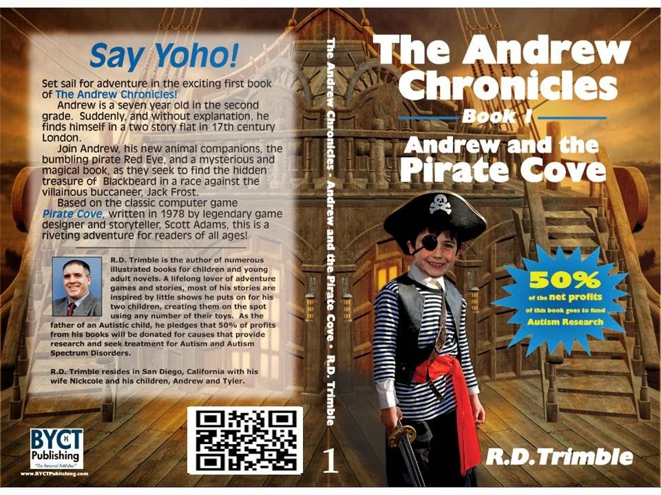 R. D. Trimble and sonsR. D. TrimbleR. D. Trimble was born in San Diego, California in 1971 and has spent most of his life in the community of Clairemont except for a five year period in the 90s when he moved to Arizona seeking adventure and the promise of a good career. He returned home, fell in love, got married, had a heart attack at 33, and at 34 had his first child, Andrew. While he always loved reading and creating stories, it was his son’s dislike of bath times that got him to use them constructively, creating little “bath shows” for his son, making up pantomimes and plays with action figures to make his son laugh and sometimes to educate him on subjects such as history, math, and science. He began writing and illustrating children’s books when Andrew was three years old, he later shifted to chapter books and began writing “The Andrew Chronicles”. His first published novel “Andrew and the Pirate Cove” based on the original 1978 computer game Pirate Cove by Scott Adams (a good friend of the author) was published by Books You Can Trust Publishing on 03/24/2014. The sequel “The Revenge of Jack Frost” was published 12/17/2014. The third book “The Temblor Stone” (Tentatively titled) will be released hopefully late 2015 in time for Christmas. In his spare time, Rusty enjoys reading, playing text adventures on his computer, writing new stories, and most importantly taking trips to the zoo, Sea World, Legoland, the gym, and anywhere else that might be fun with his children. He resides still in San Diego with his wife Nickcole and his beloved children Andrew (b. 2005) and Tyler (b. 2012).