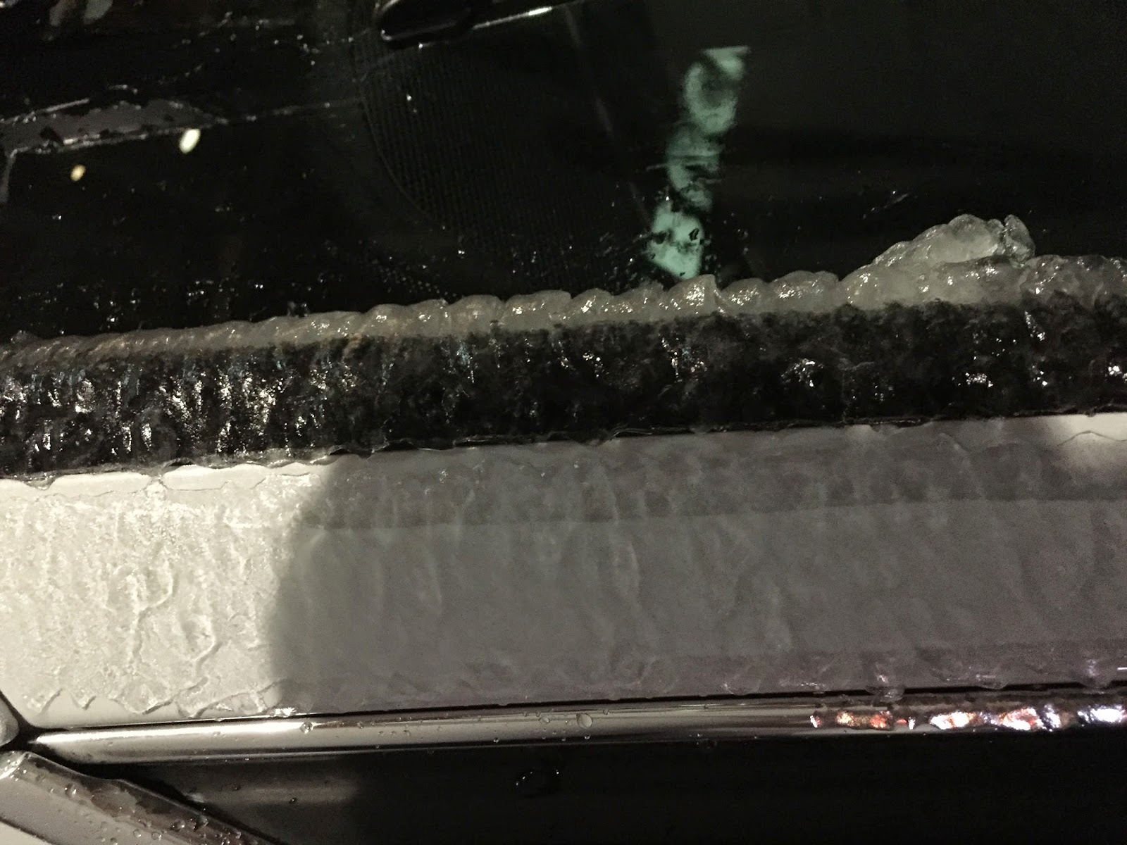We stopped in Ellensburg to get something to drink and go to the bathroom. I also wanted to clear the windshield wipers which were caked with ice and nearly useless. There was, I would estimate, about an 1/8th inch of ice on the frontal areas of the car. The windshield stayed mostly clear because I had the defroster going full blast most of the time. To the right is a picture of how much ice there was on the windshield frame (A pillar).We escaped Ellensburg just before the "sleet" (read: freezing rain) started. The rest of the trip we had bare and wet roads. I was nervous about black ice or a sudden ice spot so I never turned on the cruise control and kept my speed below 70 most of the time (my right foot is a rebel and I did catch myself at 78 a couple of times).
