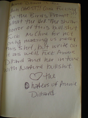 1. Last spring I picked up this copy of Dillard's Pilgrim at Tinker Creek for around a dollar and a half. Only when I got home did I discover the former owner's inscription inside. As an exhibit of a peculiarly enduring stylistic mode that might be dubbed 'Teen-Scourge,' it caused me such absurd delight that I believe it's worth sharing. (NB: If you happen to have small children at hand, you may wish to refrain from reading aloud.)