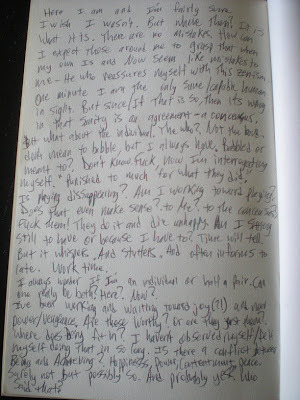 "Here I am and I'm fairly sure I wish I wasn't. But where then? It is what it is. There are no mistakes. How can I expect those around me to grasp that when my own Is and Now seem like mistakes to me -- he who reassures myself with this Zen-ism. One minute I am the only sane/capable human in sight. But since/if that is so, then it's wrong in that sanity is an agreement -- a consensus. But what about the individual. The Who? Not the band. don't mean to babble, but I always have. Babbled or meant to? Don't know. Fuck, now I'm interrogating myself. "Finished too much for what they did." Is playing disappearing? Am I working toward playing? Does that even make sense? to Me? to the consensus? Fuck them! They do it and die unhappy. Am I sitting still to have or because I have to? Time will tell. But it whispers. And stutters. And often informs to late [sic]. Work time. "I always wonder if I'm an individual or half a pair. Can one really be both? Here? Now? "I've been working and waiting toward joy (?!) and now power/vengeance. Are these worthy? Or are they just them? Where does Being fit in? I haven't observed myself/felt myself doing that in so long. Is there a conflict between Being and Achieving? Happinesss [sic], Power, Contentment, Peace. Surely not but possibly so. And probably yes? Who said that?"