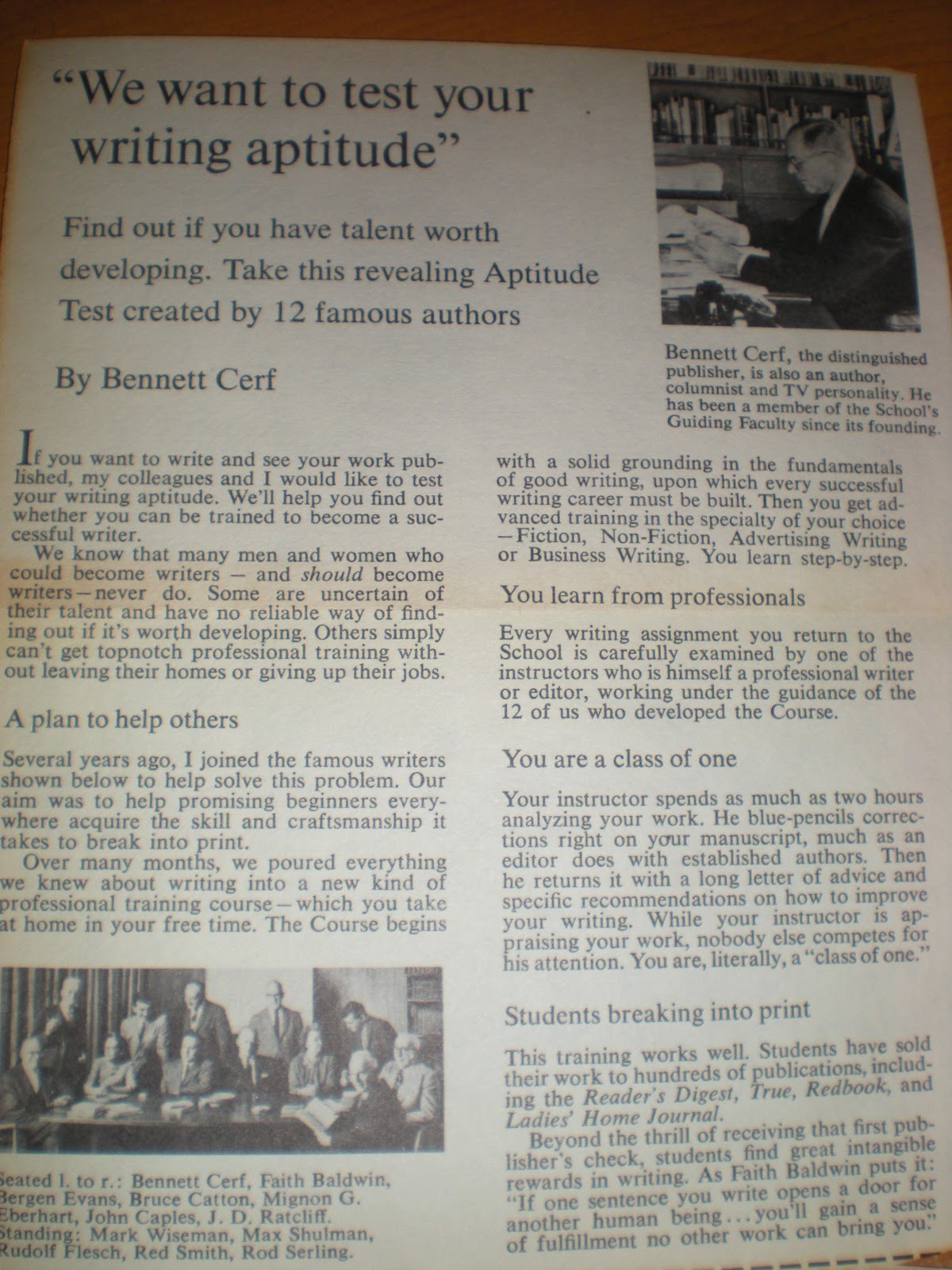 Inside the brochure, the "Famous Writers School" and its "revealing Aptitude Test" are extolled as sure means of harnessing creative inspiration via the guidance of famous literary professionals -- and of launching a "successful writing career," finding "success in writing," etc.