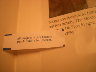 More of a proverb than a fortune, really, like the contents of most fortune cookies these days -- but how appropriate for Baker's book. And what an affecting reminder of the tangible, material, solitary, and yet simultaneously and mysteriously interpersonal joys that only books in tactile, material (non-digital) form can afford.