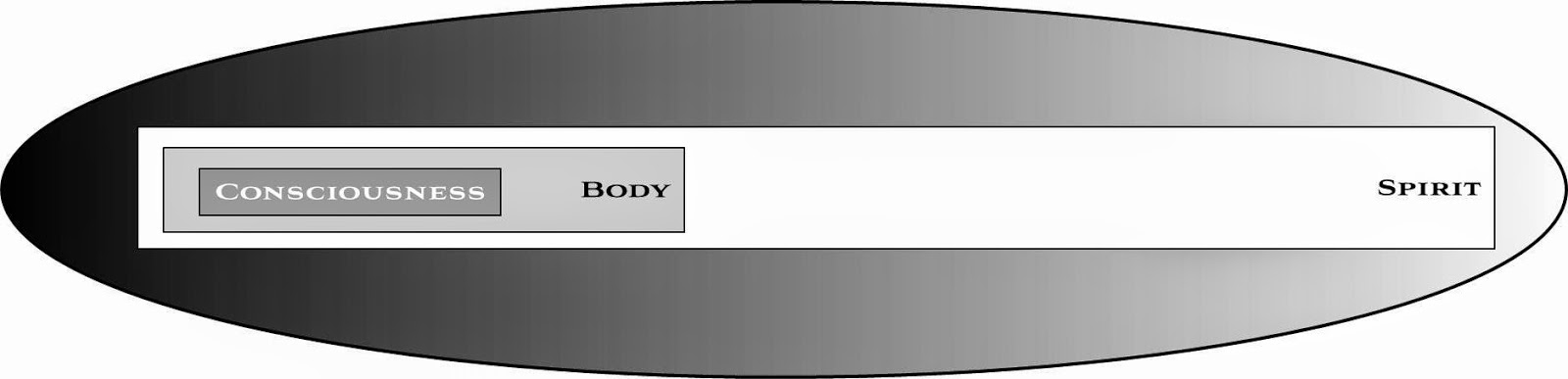 Multiple ExistencesAs all of creation was pulled apart, objects of similar natures came to rest in groups along the spectrum. It was at this point when the three parts of a being’s existence became evident:1) The bodyoccupied only one location along the spectrum—the environment where it was most suited to exist.2) Within the container of the body, the soul or consciousness experienced life at the outer limit of where it came to rest during the casting out of the Evil One.3) The spirit—containing both the body and consciousness—extended from that point, all the way back to the Holy One at the far end of the spectrum. In this way, the spirit became like a bridge that spanned a range of creation’s spectrum.
