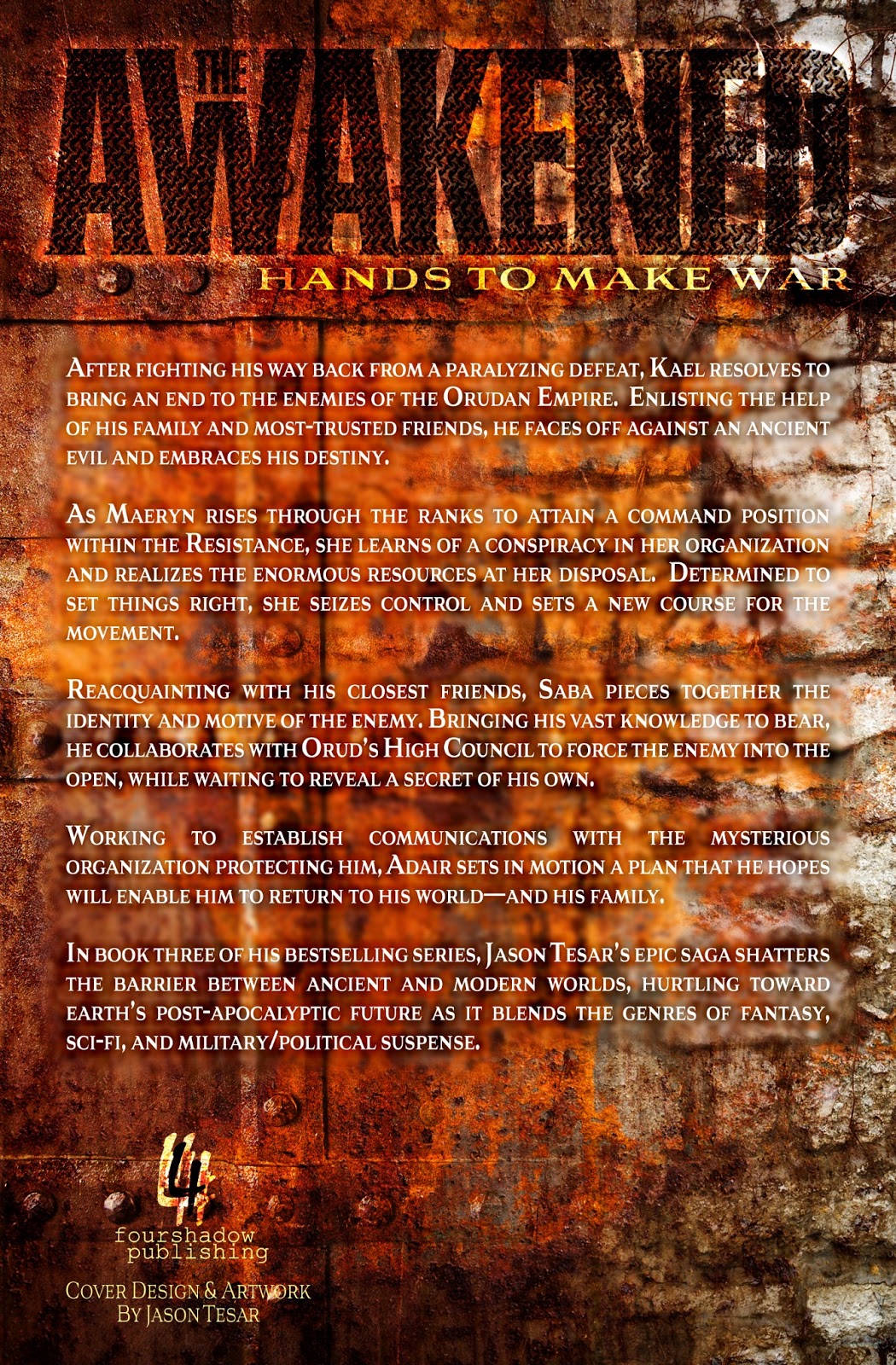 I’ll admit—from novel to novel—the first two Awakened books ( Awaken His Eyes and Paths of Destruction ) don’t have neat, tidy endings. Along with the third book, they were all written as one story and at the time I wrote them, my knowledge of story construction and my philosophy of endings were both undeveloped. But there is another type of ending I was able to accomplish at the end of Hands To Make War —an intermediate point of resolution. For those who haven’t yet read the third book in the Awakened series, I won’t spoil the details. I will point out, however, that the forces of antagonism which produce the physical conflicts in Kael’s world—and define the backbone of the story—are dealt with. The primary plot in the ancient world is resolved—the first trilogy completed. At the same time, the stage is set for the next segment of the series which jumps into our modern world. This closing of one door and opening of another is a major milestone in the larger saga, resolving the immediate matters while propelling the reader forward.