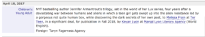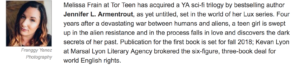 “Melissa Frain at Tor Teen has acquired a YA sci-fi trilogy by bestselling author Jennifer L. Armentrout, as yet untitled, set in the world of her Lux series. Four years after a devastating war between humans and aliens, a teen girl is swept up in the alien resistance and in the process falls in love and discovers the dark secrets of her past. Publication for the first book is set for fall 2018; Kevan Lyon at Marsal Lyon Literary Agency brokered the six-figure, three-book deal for world English rights.”