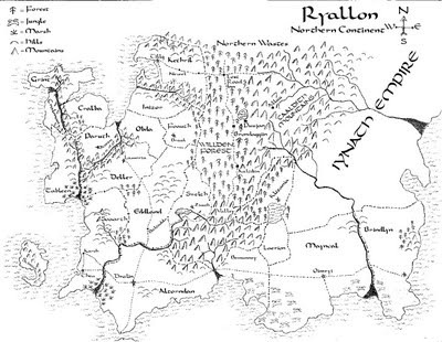 The problem was that I hadn't conceived of that part of the map, so I had to draw it. Then I came up with the kingdoms of Mayncal and Brindlyn as well as the Iynath Empire. Well, I hadn't conceived of those either. So they were placed to the east of the original maps. The Iynath Empire is mostly desert. I was raised in the Mojave Desert and found myself amazed at how everything west of the Sierra Nevadas was lush and green while everything to the east was dry and largely barren. That's probably where I got the inspiration for that sort of climate set up.