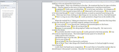 Now as you might imagine, 5,6, or 7 thousand is a lot of quotation marks to do a search on. I developed a rhythm of double tapping. That was better, but still not efficient enough. I then developed a rhythm of multiple double taps. taptap, taptap, taptap, taptap. At the end of each double tap, I should be at the end of a sentence and the search number should be an even number. If not, then I know I missed one or have an extra. I go back over the last few sentences and fix it.