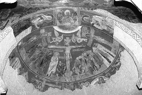 Tokalı II'de Çarmıh Sahnesi. İsa'nın iki hırsızla birlikte Golgotha'da çarmıha gerilme sahnesi. Üç meryem, yüzbaşı ve askerler orada. İsa Yuvannis'e işte annen diyor, Meryem'i gösteriyor. Resmin sıvası dökülmüş, düşen parçaların altında ikonakırıcı döneme ait çizimler var.Bu kitapta benim değerlendirmelerim ışığında Tokalı Kilise kompleksi büyük bir Roma Kilisesi, bir Ayasofya kadar önemlidir. Üstelik burası zaman içinde değişik biçimlerde oyulmuş Tokalı II ile son halini almıştır. Tokalı I denilen giriş bölümünde tavan yarım silindir gibidir. Burada resmin sağ üst köşesnden başlayarak sol alt bölümüne kadar çevrimli anlatım bulunur. Yani İncil’deki sıraya göre İsa’nın doğuşundan haça gerilmesine kadar olan olaylar halinde sırayla resimlenmiştir. Bu durum Kapadokya dahil pek çok yer için sıklıkla karşılaşılan bir durum değildir. Özeldir. İkinci bölüm daha sonra oyulmuş, sonra resimlenmiş ama sonra üstü sıvanarak bugün gördüğümüz mavi ağırlıklı başın gövdeye oranla küçük olduğu bir tarz elde edilmiştir. Buradaki resimler Makedon Rönesansı denen bir tarzdadır. Perspektifi bilen ama kullanmayan bir el tarafından çizilmiş gibidir. Perspektif Ortodoks kilise resminde yasaktır, Katolik sanatında ise Rönesans sonrasında gelişmiştir. Bu durum, resimlerin yapıldığı 1200’lü yıllar düşünüldüğünde anlamlıdır.