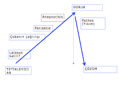 Tablo: Kral Oedipus’un Freitag Üçgeni üzerindeki görünüşüBu çizime göre kurmaca doğrudan bir çatışmayla açılır ve her adımda atılan güçlü düğümlerle tepe noktasına çıkar. Doruğa kadar geçen zaman, anlatının neredeyse tamamını oluşturur. Bundan sonra düğümler hızla çözülür ve öykü finale ulaşır. Bu, bütün kurmaca yapıtlar (öykü roman, oyun ve senaryo) için geçerlidir.Sinema yalnız edebiyattan değil, dinsel öyküler anlatan resim sanatından da bir şeyler almıştır. Örneğin resimde konuyu belirlemek amacıyla yüzyıllardır yapılan çerçeve çizgileriyle sinema perdesinin kenar çizgileri aynıdır. Portre ressamlığı da çerçeveyi kurgulamış, fotoğraf aynı tasarımı yinelemiştir. Sinema sahnesi, resimden ve fotoğraftan hareketle kurulmuş olan tiyatro sahnesinin gelişmiş bir tekrarıdır; aynı dikdörtgensel yapıya sahiptir.Tiyatro ilk kez Diderot çağında rampa ışıklarıyla sahneyi aydınlattı. Perde ortaya çıktı ve Shakespeare tiyatrosundan farklı olarak seyirciyi yok saydı: Sanki izleyiciyle oyuncular arasında görünmez bir duvar vardı ve ışıklarla aydınlatılmıştı. Bu, resim sanatının oyuna etkisidir. Tablo adıyla bölümlere ayrılarak hazırlanmış ve tıpkı tablo gibi perspektifle katmanlandırılmış olan sahnede resimler canlandırılmaktaydı. Böylece oyuncunun seyirciyle kurduğu dolaylı, ondan habersizmiş gibi görünen eylem düzeni ortaya çıktı.Sinema da aynı yoldan geçmekte gecikmedi: Tiyatro oyuncusu gibi seyircinin yokluğuna oynamayı benimsedi. Sinemanın farkı, zaman akışını kare kare göstermesi ve istendiğinde devinimi yineleyen bir buluş olmasıydı.Bu, zamanı ele geçirmenin ilk adımıydı. Üstelik devrimdi, perspektife hareket ekleyen bir görsel devrim.Sinema nasıl ki fotoğraftan esin aldıysa tiyatrodan da tablo tablo tasarlanmış resimleri canlandırmak, onları oyunlaştırmak düşüncesini aldı.Fakat iyi düşünülürse “okuyucunun farkına varan anlatı”yı da “ondan habersiz görünen anlatı”yı da icat eden asıl kaynağın edebiyat olduğu görülecektir. Bütün hikayelerde, masallarda, dinsel anlatılarda ve modern edebiyatın öncülerinde doğrudan okura seslenen yapıtlar kadar, okur yokmuş gibi, ona söylemiyormuş gibi yazılmış metinler sinemayı ve perspektifli resmi öncelemiştir.Perspektiften yoksun olan ikona, izleyicinin farkındadır. Her ikona dindara açık çağrı yapar, her dinsel minyatür de mitosu öğretir. Hiçbir figür gözümüzün gördüğü şeyler değildir. Kahramanın yüceye yolculuğudur. Bunu izleyiciye bakarak gösterir. Oysa perspektif çağıyla birlikte resim izleyiciyi unutur, kendi başına davranan figürlerin dünyasını görür. Perspektifli resim, kendi içinde bir hikaye taşımakta ve anlamı izleyiciye bırakmaktadır. Dördüncü duvar ilkesiyle çalışan Diderot sahnesiyle koşuttur. Bu dramatik gelişim, Rönesans’ta ortaya çıkan insan odaklı anlatı ile örtüşür. Artık üstün niteliklerle donanmış olan kahraman gitmiş, insan ortaya çıkmıştır. İnsan merkezli felsefe, insan merkezli anlatıyı koşullamıştır.Edebiyatın sinemaya yaptığı katkılardan biri de karakterin görünen davranışlarıyla içsel davranışları arasındaki bağı keşfetmektir. Sinema edebiyattan öğrendiği bu bağlantıyı başlangıçta uygulayabilmiş değildi; ruhsal olanı perdede anlatmanın yolunu, davranış kodları üzerinde yoğunlaşarak buldu. Yani bir bakıma davranışçı psikologların söylediği ilkeyi yaşama geçirdi: Davranış düşüncenin aynasıdır.Edebiyat, karakterin derin anlamlar kazandığı katmanlı bir yapı içerir. Büyük edebi yapıtlar, karakterin içeriden görünümünü bütün insanlar tarafından aynı biçimde anlaşılacak yapıda kurmuştur. Büyük yapıtlar insanı herhangi bir ideoloji, din yahut belirli bir disiplin ekseninde kavramaz: Edebi derinlik, tıpkı bilimin yaptığı gibi insanı soğukkanlı, uzak ve sahici bir biçimde içine çeker. Bunu yazarın daha çok betimsel ve düşünsel bir dille başardığını görürüz. Duyuların kullanılması olayın dış görünümünü anlatmaya yardımcı olur. Yani görselleşme, hipotipoz, duyuların etkisiyle sağlanır. Bu noktada, geciktirim kadar, duyuları kullanmak da önem taşır.Proust’un Albertine Kayıpadlı romanından okuyacağımız rasgele bir parça bile duyuların görselleşmeye etkisini anlamayı kolaylaştıracaktır: