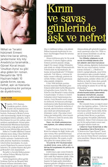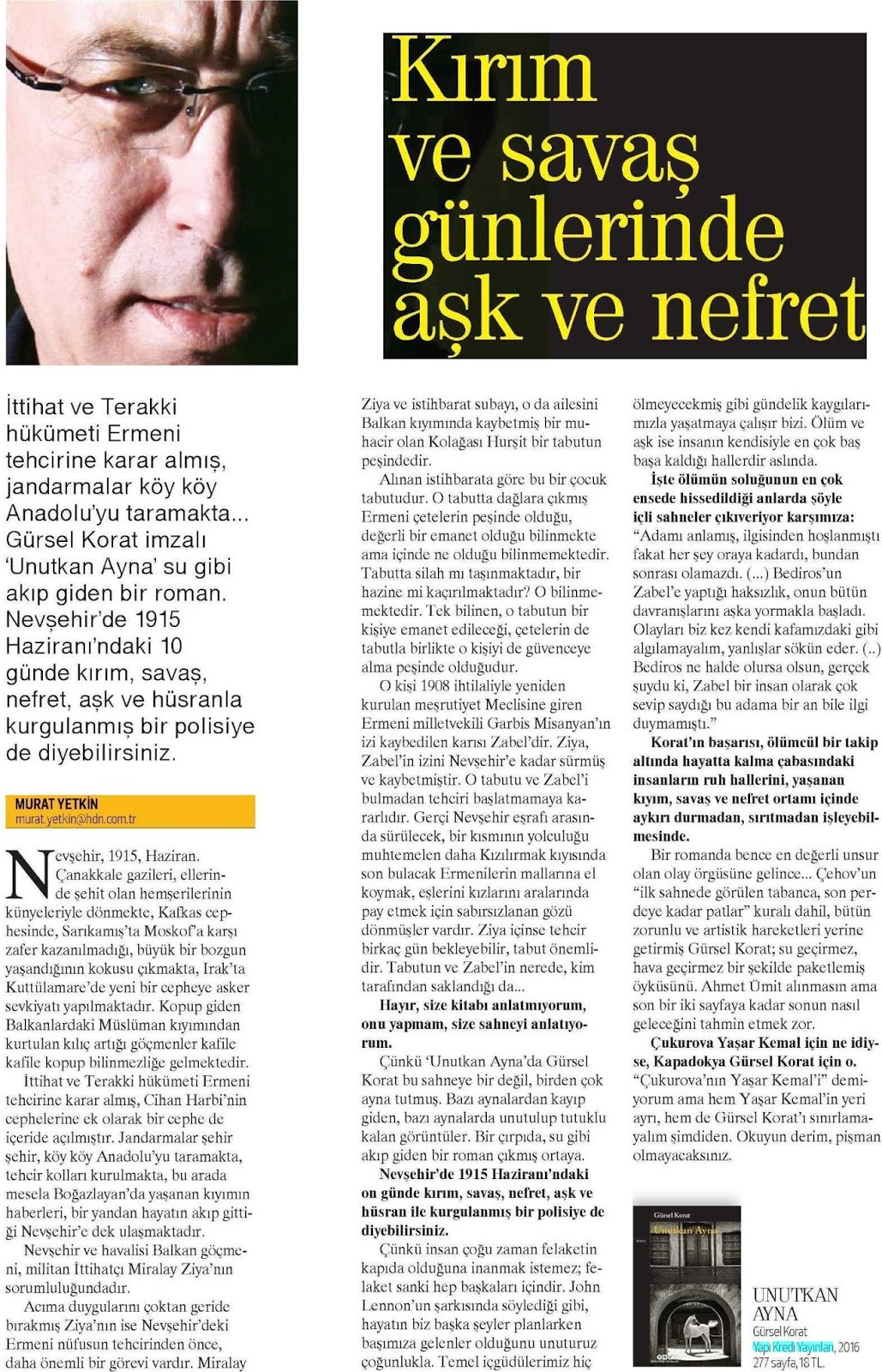 Gürsel Korat’ın son romanı “Unutkan Ayna” Nisan ayında (YKY) yayımlandı. Bu romanda 1915 yılı Haziran ayının on günü anlatılıyor. Yozgat ve Kayseri’de başlayan kırım, çoğunlukla Rumların yaşadığı Kapadokya bölgesine yaklaşırken Nevşehir’deki Ermenilerin bu olayı bekleyişi kitabın konusu. Romanda duyu organlarını çağıran bir dil, heyecanlı bir akış ve sürpriz açılımlar var. Romanın finali ise beklenmedik bir biçimde gelişiyor ve şoke edici. Bu romanı dolayısıyla yazarla bir şöyleşi yaptık.