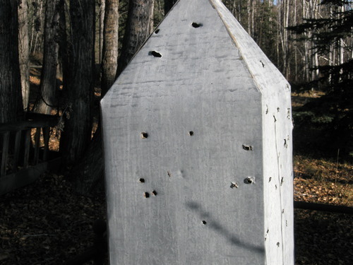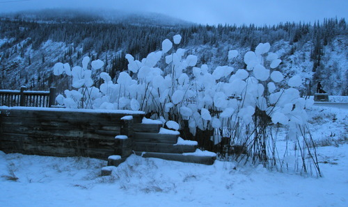 This shot is from a month ago of a tin tombstone in the cemetery overlooking Dawson. Looks normal from a distance, but up close reveals itself as a facade, evocative of the western fronts adorning the heritage buildings in town. The worst part of this tin tombstone is that it is riddled with bullet holes, with the bullets exiting towards the town. Ouch.