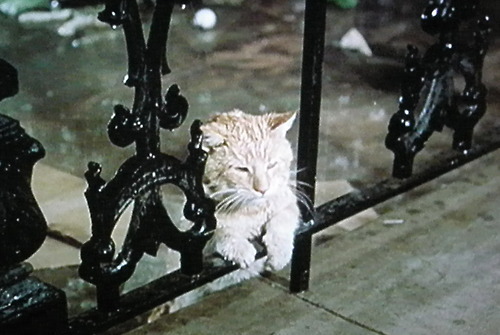 I recently saw the movie and was shocked to see Holly toss her cat out of a taxi and into an alley. In the rain (see photo). A perfect alley, she said, lots of rats and garbage. In the movie, after driving a block she regrets her action and runs back with her writer-friend and looks for the cat. In the movie they find the cat, and because her writer-friend is magically heterosexual, they hug and kiss in the rain with the dripping (and apparently quite stinky) cat between them. Happily ever after etc etc.