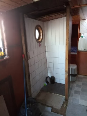 The photo above was stage one with the back and side walls removed. That was a phenomenal job in itself as the construction was fit for a load-bearing wall in a house. Seeing as this is the smallest room on a boat, it seemed a bit extreme. The back wall had not one, but three layers, two of which were on each side of a frame sturdy enough to hold the entire roof up. Luckily, it didn't or we might have had second thoughts. The tongue-and-groove ceiling also had to come out and we found two layers there as well. Rest assured, the new model will be far less complicated, and I'll post some photos of the new construction soon. It's halfway there.