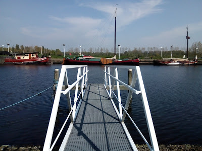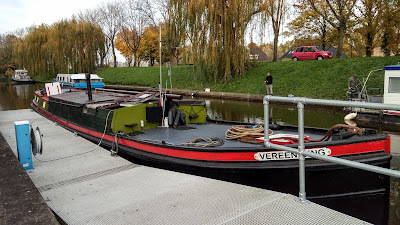 As luck would have it, the answer lay much closer than I ever imagined. We have a historic harbour in Sas van Gent, and after quite a search to find the right person to approach, I applied for a mooring and the Vereeniging has been approved. I am delighted because it will be much more convenient for me (only a short run from the cottage) and it will allow me to spend time on her more easily. She will fit in very nicely, I think, as there are several very lovely sailing barges in the harbour already. Here's a photo of the probable mooring. I love the super safe gangway!
