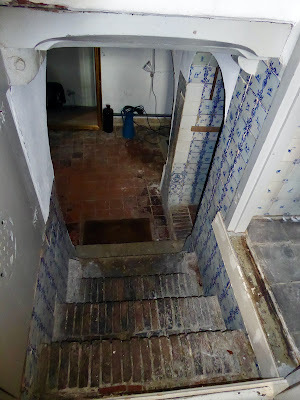 What the interior had, though, was some beautiful original tiling on the walls and floors, some of which remains to this day as can be seen in the photos below. The tiles have themes, and on the wall in the picture below, those up at the end by the stairs were all of horses and riders in different poses. Towards this end, they are people, all in pairs, involved in various activities, such as playing games, pushing each other on swings and even just talking. I found them quite delightful and was impressed they'd survived so long.