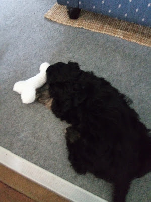 And here he is sleeping over the toy bone my daughter crocheted for him. It was so sweet the way he'd play and then suddenly just fall asleep.