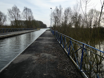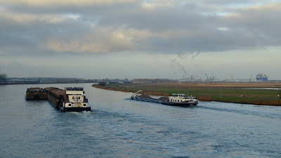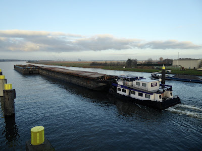 But by the time I reached the end, another one (see photo below) had caught up and overtaken me. I should mention that this canal is extremely busy and the bridge leading to the small town of Sas van Gent, the Hennie H's home port, opens at least twice an hour, and often more, during daylight hours. It continues throughout the night as well, although the openings are probably fewer, but we'd guess forty times a day wouldn't be an exaggeration. And that's just for those vessels that can't pass under the bridge; there's a constant stream of barges ploughing their way to and fro.