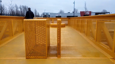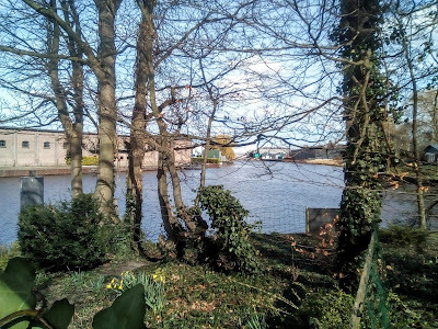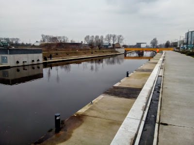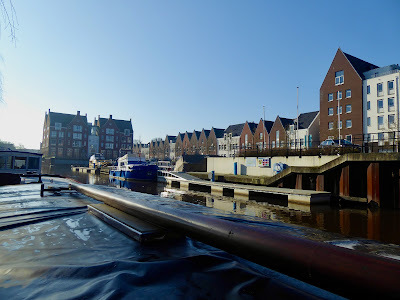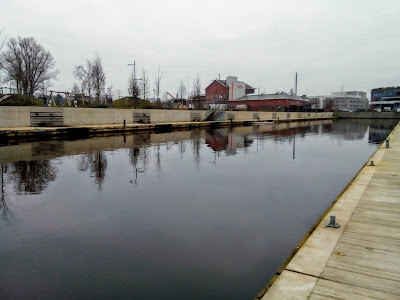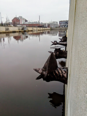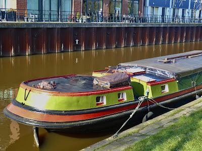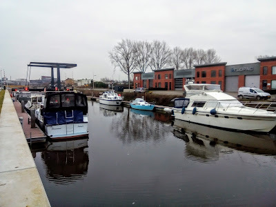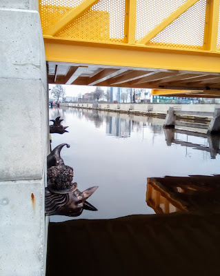 Despite the gloomy weather, I took some photos (see below). The quays look a little bleak as much of the new paving is going green (like everything else at the moment), but there were plenty of people out and about, especially in the children's playground adjacent to the harbour. I think you could say it's an area under development, so I'll look forward to seeing if it attracts more boaters when the weather's warmer. For now, I particularly liked the yellow footbridge and quirky gargoyles mounted in the walls.