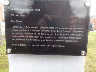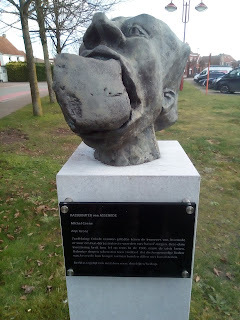 Another interesting snippet from Assenede, and this time a more quirky one, is told by these two photos below. The odd sculpture of a man eating a stone derives from the story in the sign, which tells us that several centuries ago, the people of Assenede spent what was considered to be a wasteful amount of money on having their village street paved with stone. This expense came back to bite them when during a crisis (probably a famine) in the 19th century, the residents of the village were starving and had no money to buy food. The story goes that the people of the surrounding villages mocked the good folk of Assenede by saying they'd have to eat stones instead; hence the rather alarming looking sculpture. It seems a bit unfair on them really given that it was probably their forebears who committed the costly folly.
