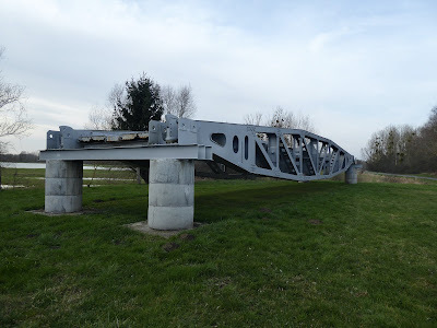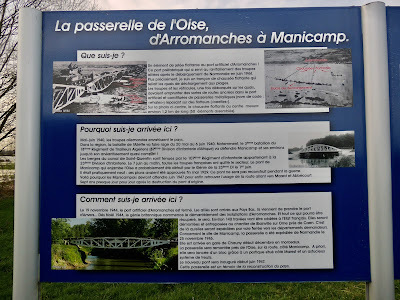 In brief, and as I understand it, the real bridge over the Oise at Manicamp was destroyed at the end of May, 1940. As the information says, it was brand new but was never reconstructed during the war. Instead, this section of a 'floating road bridge' (designed by English engineer, Allan Beckett and used as temporary ports in Normandy) was installed so that locals could at least cross the river and use their normal route. However, as it was only put in place in 1947, the poor souls had to wait nearly seven years to regain access to the villages and towns on the other side.