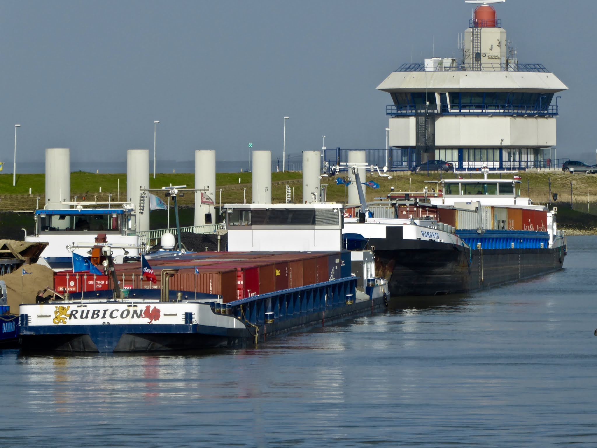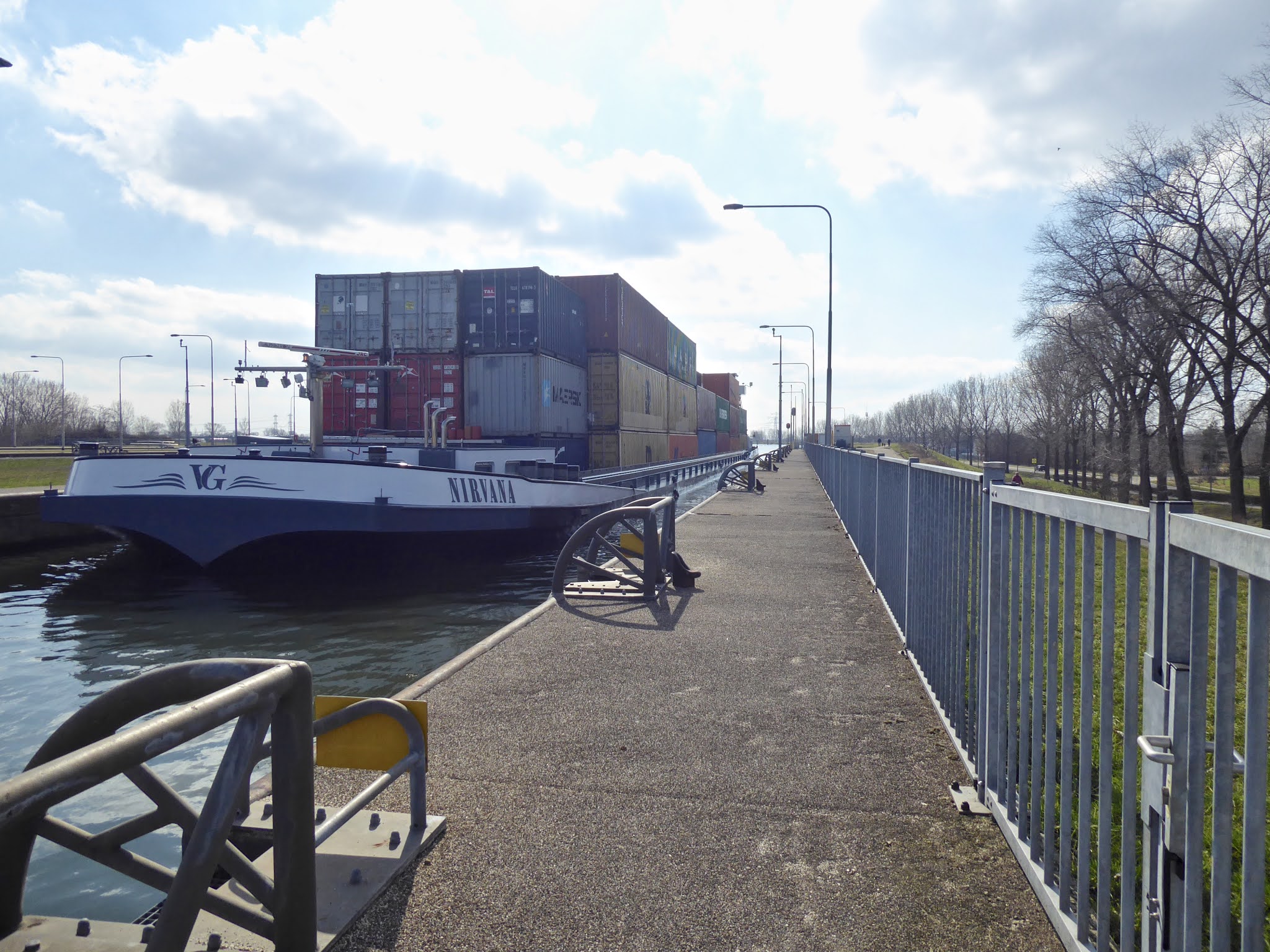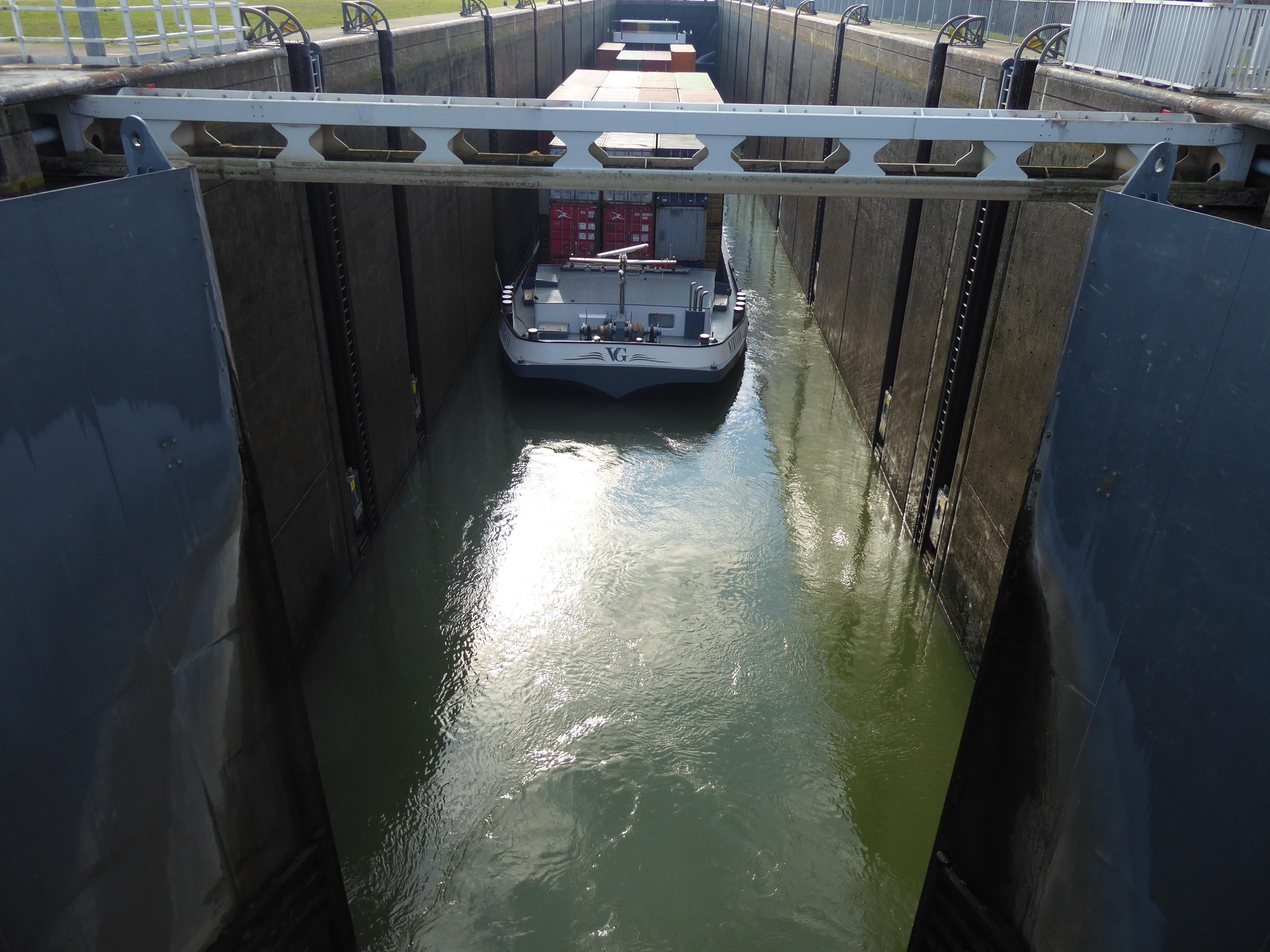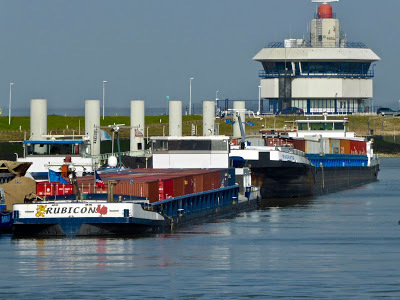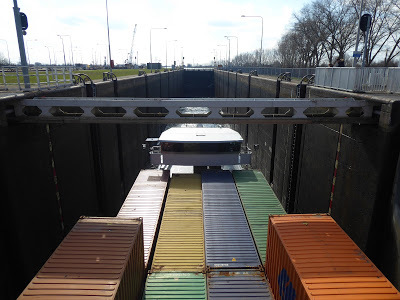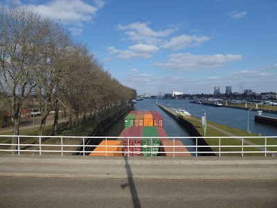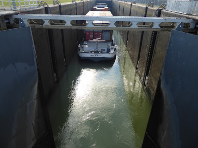 While I'm on the subject of superlatives, I'm sure readers here know by now that we cannot stay away from the water and boats for long, so on our way home we stopped at Maasbracht to look at the Netherland's deepest lock, which is found on the Juliana Canal that runs parallel to the Maas. I should say that most locks in the country reflect the flatness of the landscape and are rarely more than a couple of metres deep. The fall on this one is almost 12 metres, which is impressive by anyone's standards. We just struck lucky when we saw this container barge coming in and had to watch the whole process, of course.