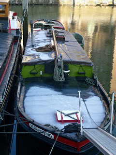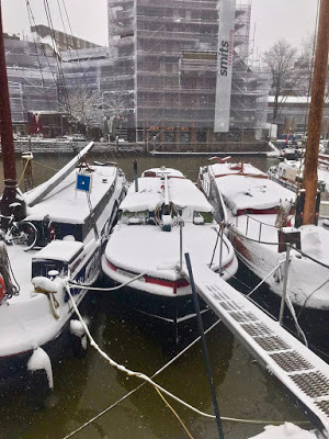 Apparently, it will snow again tomorrow, but then it will simply freeze for a few days and won't even make zero centigrade until next Saturday. Fortunately (or not) I have now escaped to Zeeland where it is a) a couple of degrees warmer and b) easier to manage than skating over a frozen foredeck and negotiating a snowy (and long) gangplank before leaving my own premises. However, I hope I can get back again before it all thaws as I'm very anxious about frozen pipes and pumps. Since being a master worrier is my most advanced skill, I can dream up worst case scenarios that none of you would never have thought possible (oh yes, I can do that and more). So, I shall be distinctly uneasy until I can check on my lovely barge's bits in person.