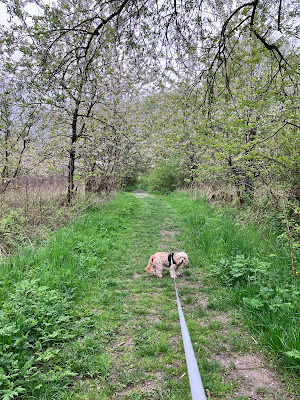 Then, there are the cats. Almost as if designed to send Zoe wild, there are cats everywhere. Some belong to households, some don't, but every time we go out, we see cats dashing across our path. Zoe's relationship with our feline friends is, as they say on Facebook, complicated. She adores them indoors and will sit gazing lovingly at a cat for hours, but outside, they must be chased. As a result, she's on high alert here and begins every walk with a challenging strut as if to say, "Right, you feral felines. I'm here and ready, so watch out!" I have to be extremely careful to keep the gate shut, because if she saw a cat, she'd be after it in a flash. And our little house is right next to a busy railway line. That doesn't bear thinking of, does it?