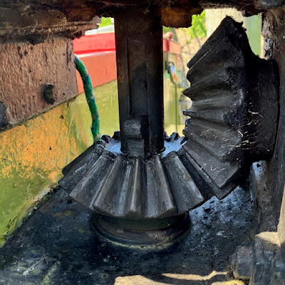 At first, I thought the stiffness might have been because the cog wheels had become too packed with old grease, so I spent some time digging it out and cleaning the wheels. There's still more to do, so I'll keep returning to them, but it soon became clear that this isn't what's causing the resistance.