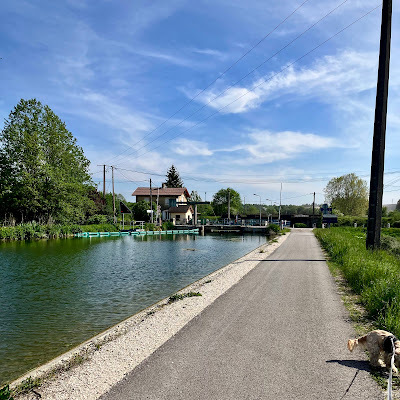 We've been back in France again for the past nine days, immersing ourselves in the Crumbly Cottage, Mark II and our village here. It really is an extraordinarily lovely area, with the wooded hills of the Marne valley beckoning us everywhere we look. My favourite place is undoubtedly down at the canal side where I take Zoe for walks every day. The Canal de la Marne à la Saône, now known as the Canal entre (between) Champagne et Bourgogne (Burgundy) is not a major route and rarely used by commercial barges, but I keep hoping I'll see a boat or barge on the move. So far, I've been out of luck, but the season's still young and the utter peace of the towpath is such a joy. All I can hear is birdsong, especially the skylarks that trill and whistle high above me.