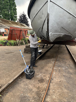 Doing the bottom is always a challenge, but Jodie, my daughter, had the brilliant idea of bringing two small platform trolleys she'd bought at Ikea when she moved house. We used them to sit on and scoot our way down the slipway under the boat, rolling paint on as we went. What a difference they made! Even so, it was heavy work, and we were both glad when we'd finished both the primer and the blacking of the bottom. We then put extra coats of black coating on the water line, which is always where boats get the most wear.