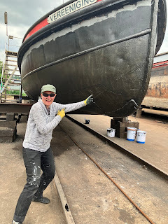 Tomorrow, we'll finish applying the primer and hopefully begin on the top coats. There are some anodes to replace and a couple of holes above the water line to be welded, so we'll probably be there until the middle of next week.