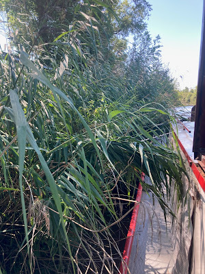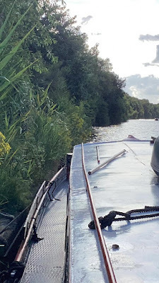 It wasn't long, however, before the heat was becoming just too much. The temperature was well over 30C and we were roasting on our steel decks. I'd moved Zoe into the only shady area next to the steering wheel, but that didn't help us. Koos had had enough, so when he spotted a bank of reeds in the shadow of some trees, he decided that was where we were going to rest up, come what may.