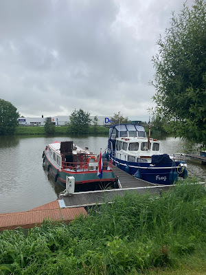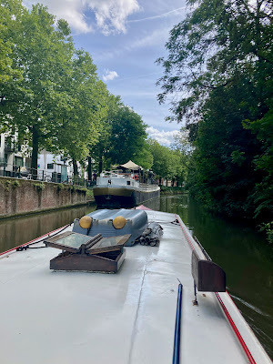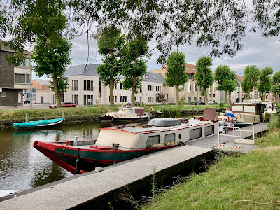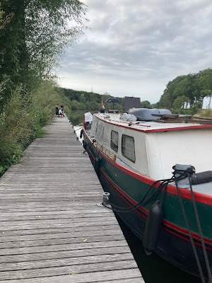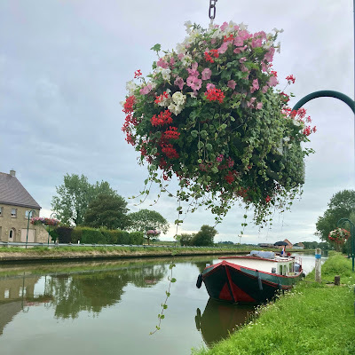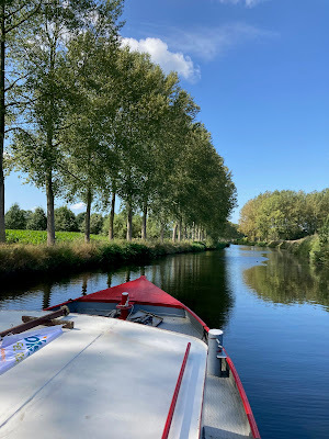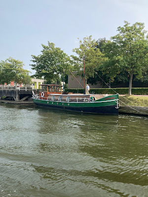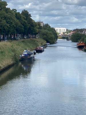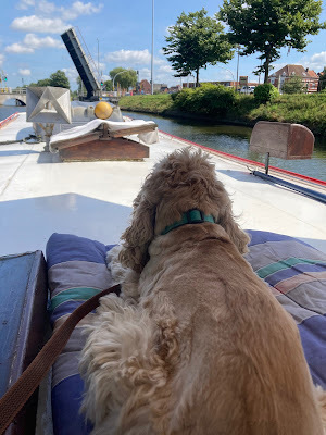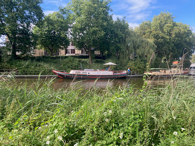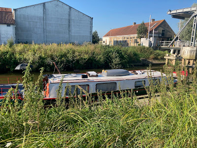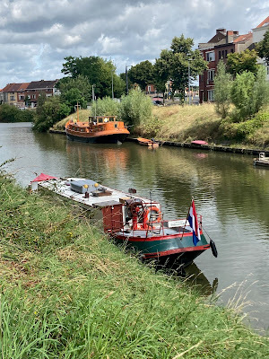 When we arrived in Veurne, we made contact with an English couple on a beautiful Dutch tjalk moored at the beginning of the pontoon where we also found our shady spot. They kindly advised us there was plenty of space and helped us locate the harbour master's office where we could pay our dues and get the electricity connected. On our last morning, they came by with their gorgeous old dog, Bilbo, and I discovered that we two ladies were both members of the Facebook Women on Barges and had, in fact, 'known' each other for years. Lisa is also a fellow scribe and has written three books about their life and travels in France. You can find them on Amazon here.