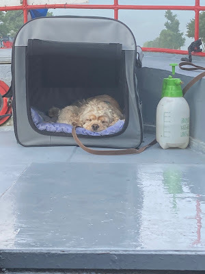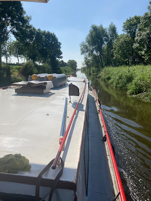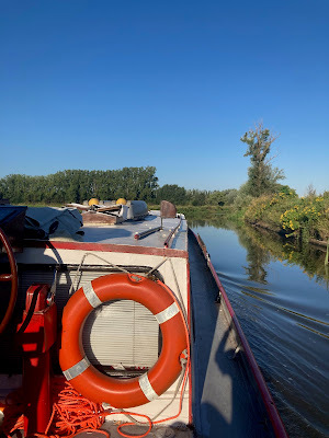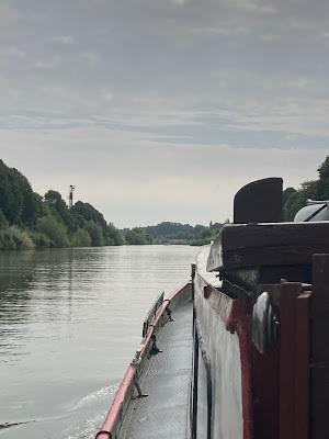 It was eight o'clock the next morning when I took the photo above of Koos turning onto the river. I'd taken Zoe for her walk and, knowing there were moorings on the river, I'd asked him to pick me up there after he'd been through the lock. It was a glorious sunrise and the day started well with a delightful French couple helping Koos hold the Hennie H while I climbed on board with Zoe. I should mention she (Zoe) had been a little gem ever since we left, taking everything in her stride and accepting faring life without complaint or question. She genuinely seemed to enjoy all the new walks, sniffs and encounters we had, but this day would be a challenge as we knew the temperatures were going to soar.
