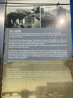 Up until the 1990, they told us that local farmers used to erect a wooden bridge over the Ijzer river every April to give them easy access to their pastures on the opposite bank where they took their cattle and collected the hay (hooi). Come October, they would take it down again and leave the river free for the boats to pass through. This movable bridge (in west Flemish, piete) was built so that sections could be removed if a boat needed passage, but when pleasure boating became so much more popular, it was decided to remove it permanently and it was last taken down in 1990.