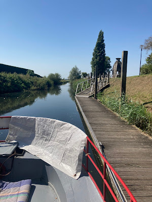 Eventually, we pulled into a quay just before what is called the Keersluis Beernem, which would be the Beernem stop lock in English. Its purpose here is to control the level of the water on the canal and possibly to prevent flooding, but not to raise or lower boats. Anyway, the quay wall, although high, was empty of boats and we had a nice choice of ladders and bollards from which to choose. Koos had to help me get Zoe off as I haven't mastered the art of climbing ladders while carrying a dog, but apart from this challenge and a few bumps from passing barges, it was just what we needed. Peaceful, rural and perfect.