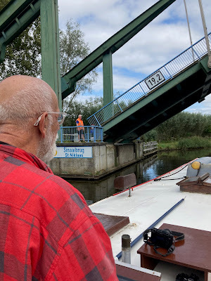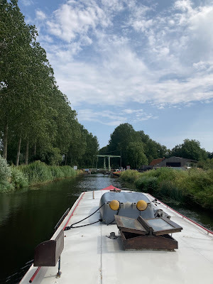 After seven kilometres of peaceful cruising, we had to start a blokvaart. You may remember this from the last post. It's when we have to be at the first of a series of bridges at a specific time and then we can go through all the subsequent bridges in the series. On the Moervaart, there are seven and it takes about two and a half hours to complete them all.