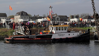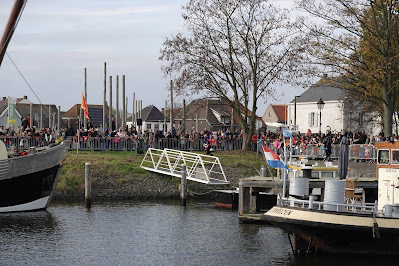 Our move left the way clear for a tugboat to arrive bearing his nibs, Sinterklaas. To our surprise, the good bishop has moved into the modern era and far from using a traditional steam tug for his tranport, his ship was a rather modern commercial tug, such as we often see working on the waterways here. Anyway, the kids didn't care and traditionalists merely frowned because the crowds that gathered to greet the saintly man were full of good cheer.