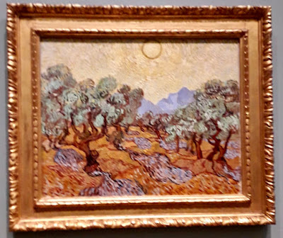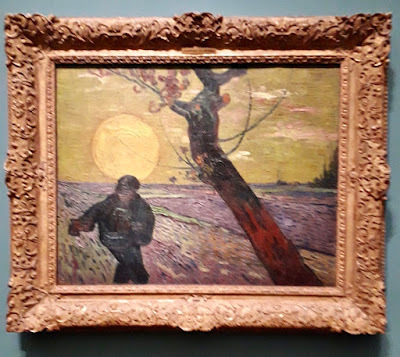 There were so many other wonderful works, but it was impossible to take photos of them all; there were too many people and it was too difficult to get a good view. I also had very little battery life on my phone to spare. My sister did better. Here are two others I loved. They're slightly fuzzy, but still faithful to the originals. Apparently, Van Gogh felt The Sower (the lower picture) was one of his most important works from his time in Arles. I think they're both superb. The Olive Grove is so captivating in its sense of those ancient trees in the heat of summer.