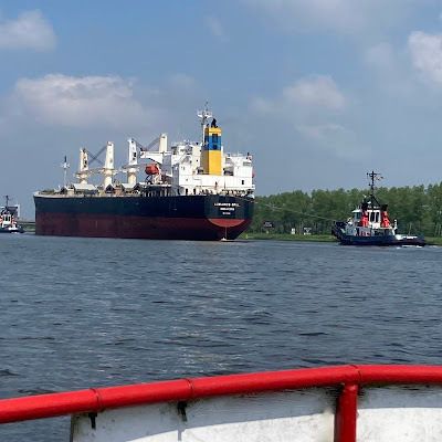 Up ahead a perfect distraction appeared. A large sea ship was approaching us being towed by some of the big beefy tugs I'm so fond of. It was a fantastic sight as it slowly passed us on its way to Terneuzen and the Channel.