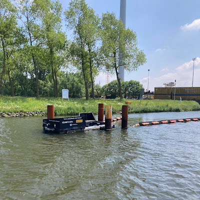 And this contraption below is a clever plastic collector. Since the wash from the barges pushes plastic waste to the side, it is easy to trap it in this receptacle here. I've never seen it before, and I'm guessing it's a new invention.